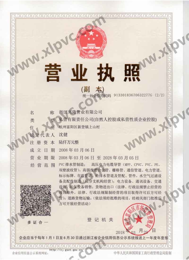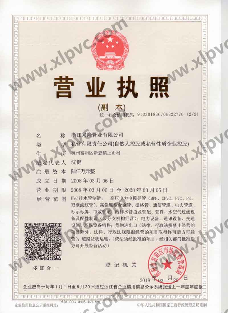 浙江興隆管業(yè)有限公司位于杭州市富陽區(qū)(杭州第九新區(qū)),坐落在新登鎮(zhèn),相距杭州僅60公里,水、陸、空交通運輸十分便利。浙江興隆管業(yè)有限公司前身為富陽興隆塑料制品廠,成立于1992年,2008年改名浙江興隆管業(yè)有限公司,數(shù)十年來,公司一直至力于管道的生產(chǎn),目前公司擁有國內(nèi)先進(jìn)的CPVC保護管生產(chǎn)線,HPVC()雙壁波紋管生產(chǎn)線,多孔管生產(chǎn)線,玻璃鋼電纜保護管生產(chǎn)線、MPP電纜保護管生產(chǎn)線。生產(chǎn)的主要產(chǎn)品有:CPVC電纜保護管、MPP電力電纜保護管(頂管)、高強度塑合金管、HDPE給排水管、HPVC()雙壁波紋管、玻璃鋼電纜保護管、埋地通信用的PVC-U多孔管、PE直壁管、PVC-U雙壁波紋管、梅花管等,年生產(chǎn)能力達(dá)20000萬米。